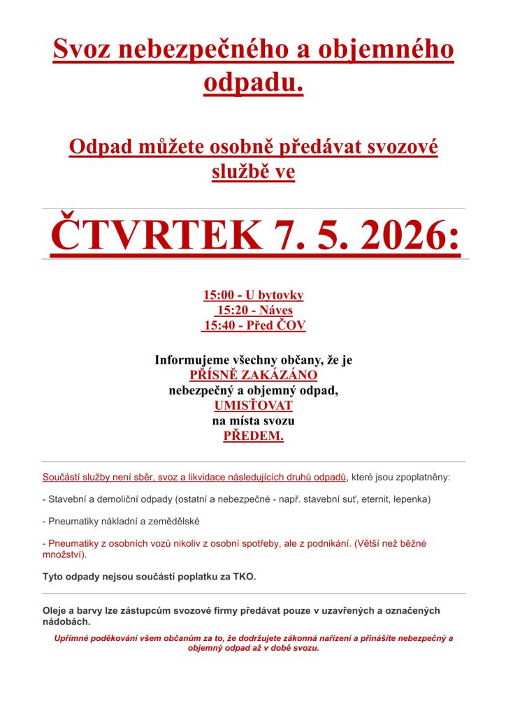 Upřímné poděkování všem občanům za to, že dodržujete zákonná nařízení a přinášíte nebezpečný a objemný odpad až v době svozu.