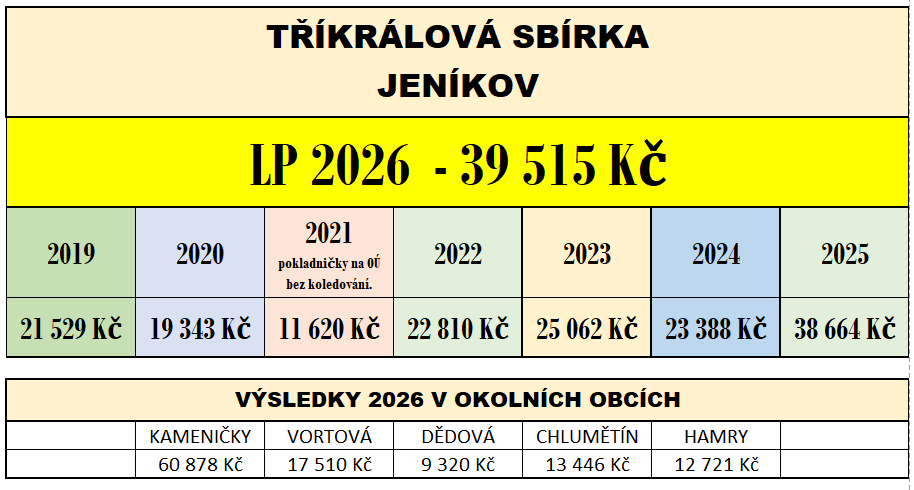 V sobotu 10. ledna 2026 i naší obcí procházely skupinky malých tříkrálových koledníků. Díky vaší štědrosti a velkým srdcím se u nás vybralo rekordních 39.515,- Kč.