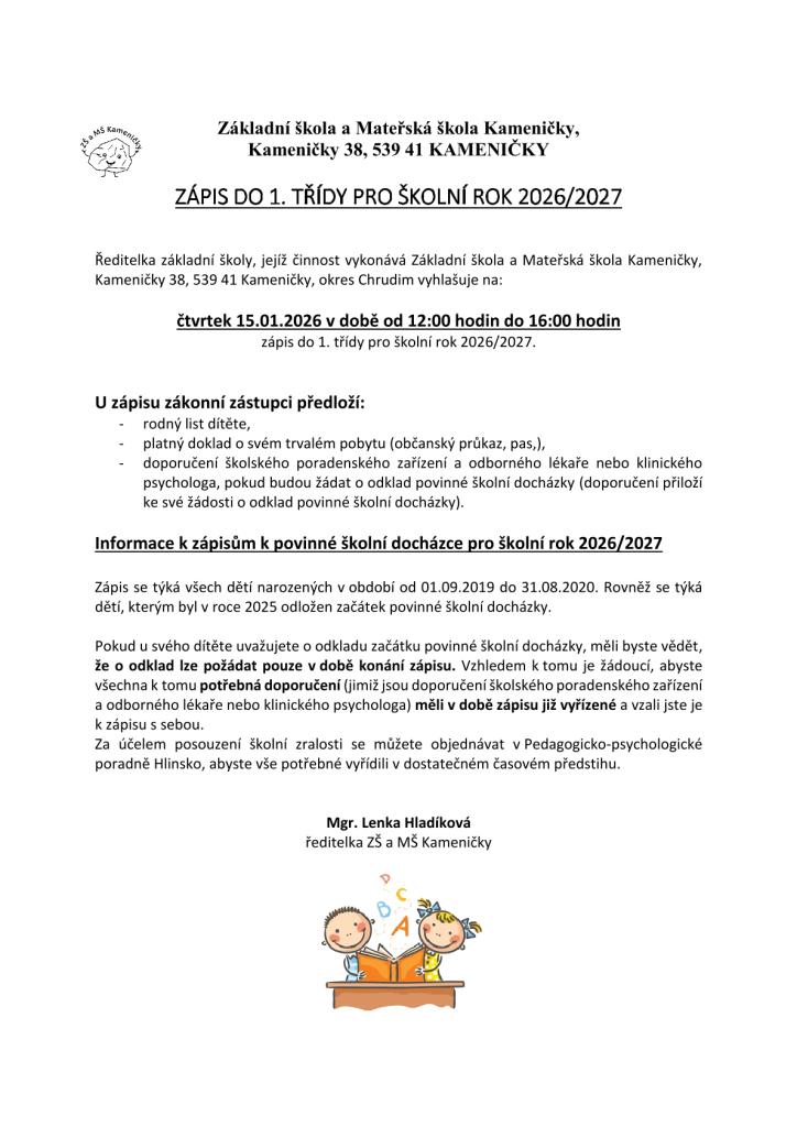 zápis do 1. třídy pro školní rok 2026/2027.